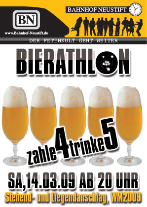 14. März 2009 Bahnhof Neustift in Passau Bierathlon @ Bahnhof Neustift Jetzt startet im Bahnhof der Bierathlon nach dem Motto “zahle4trinke5”, das 5te Bier ist geschenkt. Auch bei uns geht die Starkbiersaison nicht spurlos vorüber!!! Du bestellst 4 kleine Bier und bekommst dafür ein 5 gratis!!!! Wie beim Biathlon ist beim Bierathlon , Liegend-Stehend und Knieend trinken erlaubt!!!!! Für Ladies ist der Prosecco bis 23.00 gratis!!! Das Tanzen auf Tischen und Bänken ist ein muß für alle Die erste Gruppe( Fußballer, Feuerwehrler, Freunde ,Mädchen......) im Bahnhof bekommt eine Fl Prosecco oder 1 Fl Wodka gratis! Die zweite Gruppe jeweils ein offenes Getränk!! Die dritte Gruppe einen Shot!!! Also raus zu uns!!!! Lokal öffnet um 19.00 Uhr, Party ab 22.00Uhr |