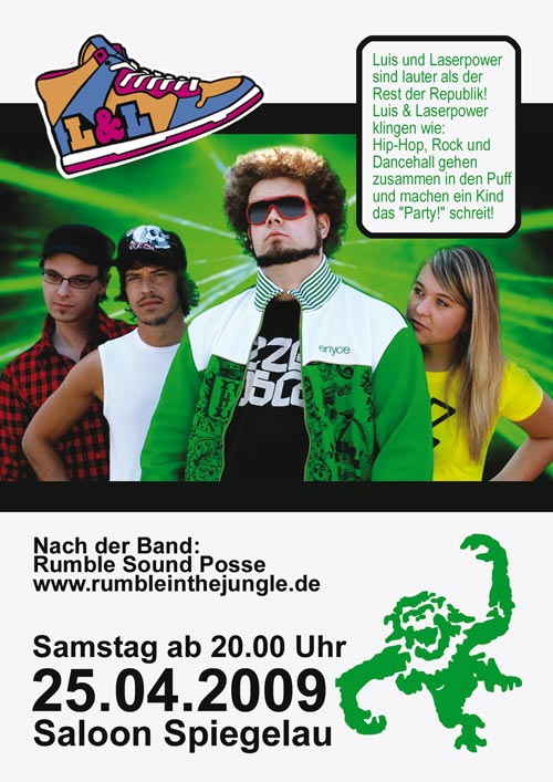 | 25. April 2009 Saloon in Spiegelau/Palmberg RUMBLE - Live Luis & Laserpower (Mannheim) www.rumbleinthejungle.de Live on Stage: Luis und Laserpower sind lauter als der Rest der Republik! Luis & Laserpower haben das nächste große Ding! Luis & Laserpower klingen wie: Hip-Hop, Rock und Dancehall gehen zusammen in den Puff und machen ein Kind das "Party!" schreit! => http://luisundlaserpower.de/ => http://www.myspace.com/luisundlaserpower |