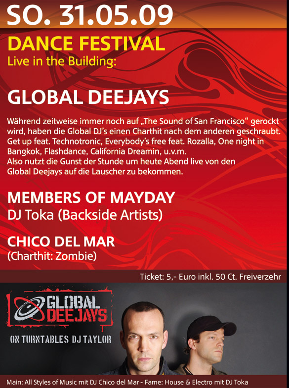 | Dance Festival Live in the Building: Global Deejays Während zeitweise immer noch auf "The Sound of San Francisco" gerockt wird, haben die Global DJ´s einen Charthit nach dem anderen geschraubt. Get up feat. Technotronic, Everybody´s free feat. Rozalla, One Night in Bangkok, Flashdance, California Dreamin, u.v.m. Also nutzt die Gunst der Stunde um heute Abend live von den Global Deejays auf die Lauscher zu bekommen. Members of Mayday DJ Toka (Backside Artists) Chico del Mar (Charthit: Zombie) |