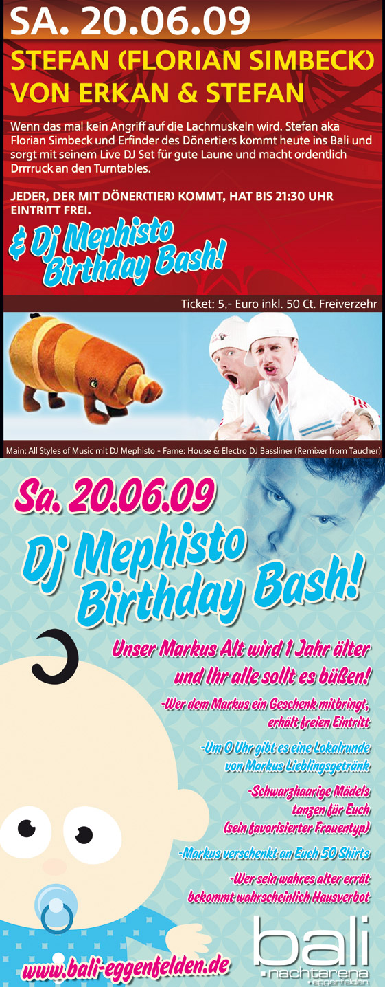 | Stefan (Florian Simbeck) von Erkan & Stefan Wenn das mal kein Angriff auf die Lachmuskeln wird. Stefan aka. Florian Simbeck und Erfinder des Dönertiers kommt heute ins Bali und sorgt mit seinem Live DJ Set für gute Laune und macht ordentlich Drrrruck an den Turntables. Jeder, der mit Döner(tier) kommt, hat bis 21:30 Uhr Eintritt frei. DJ Mephisto Birthday Bash Unser Markus Alt wird 1 Jahr älter und ihr alle sollt es büßen! - Wer dem Markus ein Geschenk mitbringt, erhält freien Eintritt. - Um 0 Uhr gibt es eine Lokalrunde von Markuslieblingsgetränk. - Schwarzhaarige Mädels tanzen für Euch (sein favorisierter Frauentyp). - Markus verschenkt an Euch 50 Shirts. - Wer sein wahres Alter errät, bekommt wahrscheinlich Hausverbot. |
