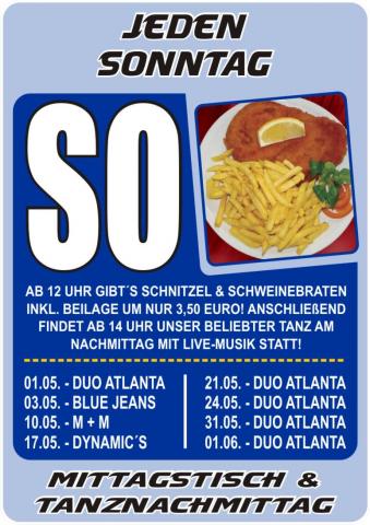 | Im Bienenkorb Straubing Mittagstisch & Tanznachmittag @ Bienenkorb Ab 12 Uhr gibt`s Schnitzel & Schweinebraten inkl. Beilage um nur 3,50€. Anschließend findet ab 14 Uhr unser beliebter Tanz am Nachmittag mit Duo Atlanta statt! |
