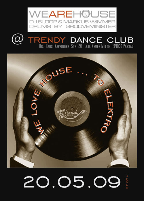 WE ARE HOUSE im Trendy Dance Club in Passau am 20.05.2009 Mit DJ SLOOP & MARKUS WIMMER Drums by GROOVEMINISTER SPECIAL: - Alle Kurze 2€ - Wodka Absolut 0,5l mit Red Bull 25€ - Alle Cocktails 4,90€ |
