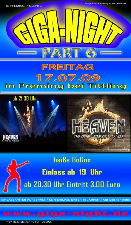 | 17. Juli 2009 in Preming Giga-Night @ Preming ab 21.30 Uhr heizt die Band Heaven "The other side of paradise" kräftig ein! Special: heiße GoGos Kein Einlass unter 16 Jahren Ausweiskontrolle Mehr Infos unter: www.giga-night.de |