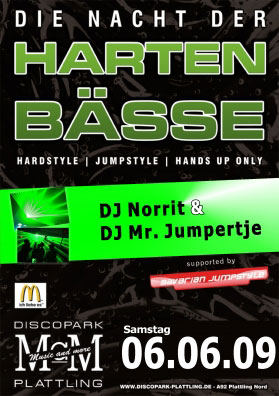 Die einzig wahre NACHT: DIE NACHT der HARTEN BÄSSE! Hardstyle, Jumpstyle & HandsUP only!!! DJ Norrit & DJ Mr. Jumpertje ziehen wieder die härteren Seiten auf! |