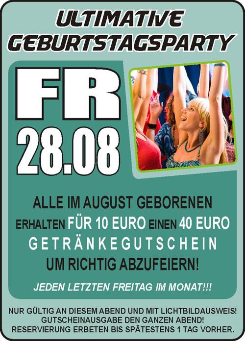 | 28. August 2009 Bienenkorb Straubing Ultimative Geburtstagsparty @ Bienenkorb Straubing Alle im August geborenen erhalten für 10 Euro einen 40 Euro Getränkegutschein um richtig Abzufeiern! Nur gültig an diesem Abend und mit Lichtbildausweis! Gutscheinausgabe den ganzen Abend! Reservierung erbeten bis spätestens 1 Tag vorher. |