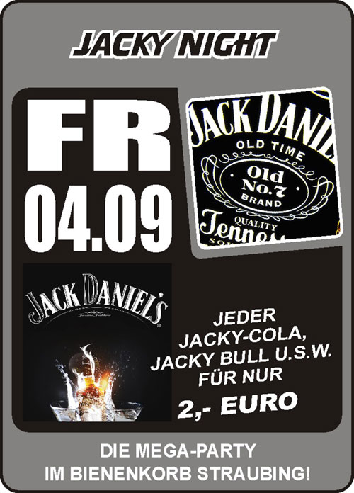 | 04. September 2009 Bienenkorb Straubing Jacky Night @ Bienenkorb Straubing ...Die Mega-Party Jeder Jacky-Cola, Jacky Bull, usw. für nur 2 Euro! |