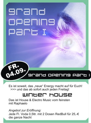 | Es ist soweit das "neue" Energy macht auf für Euch! und das ab sofort auch jeden Freitag WINTER HOUSE Das ist House & Electro Music vom feinsten mit Raphaelo Angebot zur Eröffnung Jede Fl Vodka 0,5 Ltr. mit 2 Dosen Red Bull für 25,- € die ganze Nacht |