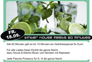| Alle 60 Minuten gibt es für 10 Minuten ein Getränkespecial für Euch. Für alle Ladies freien Eintritt die ganze Nacht. Dazu House & Electro Music vom feinsten mit Raphaelo Jede Flasche Prosecco für 8,- € die ganze Nacht |