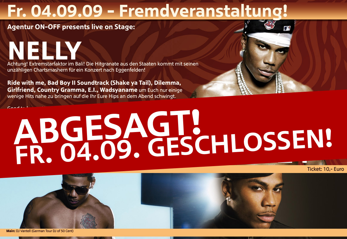 | Der Veranstalter des Auftritts von „Nelly“ am Freitag, den 04.09., die Agentur On-Off, hat leider kurzfristig heute die kleine Europatour des Künstlers abgesagt. Damit findet der bereits angekündigte und viel beworbene Auftritt in der Bali Nachtarena nicht statt. Die Bali Nachtarena bleibt somit an diesem Tag geschlossen. Wir bitten um Verständnis aber gegen diese Absage sind wir machtlos! Euer Bali-Team |