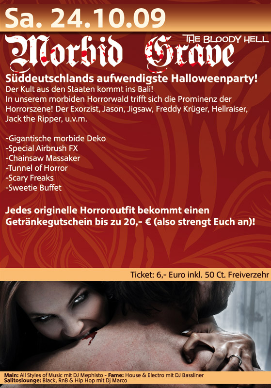 | Morbid Grave - The Bloody Hell Süddeutschlands aufwendigste Halloweenparty! Der Kult aus den Staaten kommt ins Bali! In unserem morbiden Horrorwald trifft sich die Prominenz der Horrorszene! Der Exorzist, Jason, Jigsaw, Freddy Krüger, Hellraiser, Jack the Ripper, u.v.m. - Gigantische morbide Deko - Special Airbrush FX - Chainsaw Massaker - Tunnel of Horror - Scary Freaks - Sweetie Buffet Jedes originelle Horroroutfit bekommt einen Getränkegutschein bis zu 20,- € (also strengt Euch an)! |