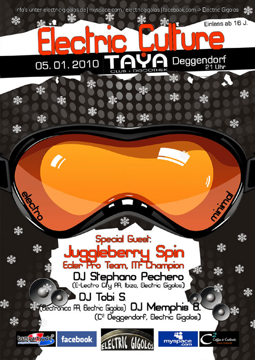 ...und weitergehts Kaum ist das neue Jahr im Lande, folgt auch schon ein weiteres Highlight in Sachen elektronischer Tanzmusik in Deggendorf! Electric Culture - Winter Edition heisst es am 05.01.2009 ab 21 Uhr im TAYA in Deggendorf! Einlass ab 16 Jahren mit gültigen Ausweis (bis 24 Uhr) ELECTRIC CULTURE Winter Edition LineUp: JUGGLEBERRY SPIN (ecler pro team // itf champion) TOBI S. (electronica // electric gigolos) STEPHANO PECHERO (ibiza // e-city passau) MEMPHIS B. (c²lubbing // electric gigolos) Jetzt in den Meetpoint eintragen und 2 von 8 Freikarten gewinnen! Gewinner sind: Kampfengal*(31) Jenny*DKNY(29) cocaflow(37) cocaflow(37)Natürlich gibts nach der Culture ab 5 Uhr morgens wieder das legendäre Weißwurst-Frühstück im C2 in Deggendorf! On the Decks: MPHASE (electric gigolos) and MATHÄUS NOCON (safaaari) |