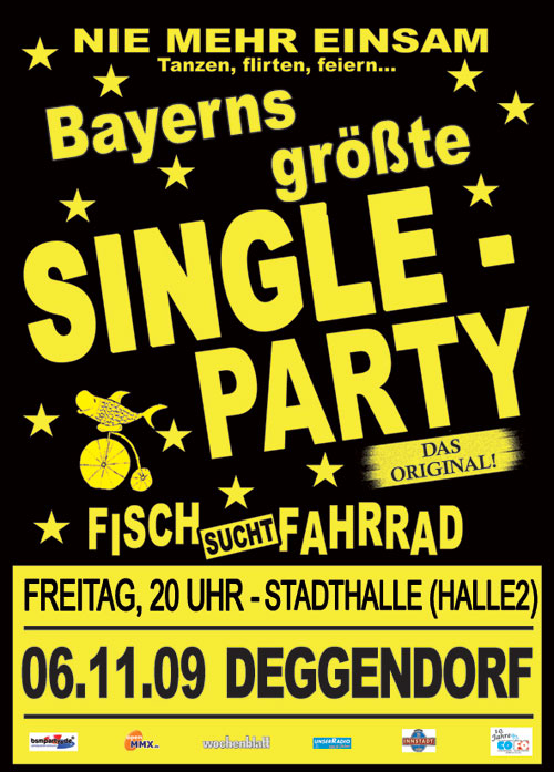 | 06. November 2009 Stadthalle (Halle 2) in Deggendorf SingleParty @ Deggendorf Knisternde Romantik wie bei Romeo und Julia oder offensives Baggern - das alles ist für die Gäste am 6. November 2009 auf Bayerns größter SINGLE-PARTY in der Deggendorfer Stadthalle (Halle 2) kein Problem. Junge und Junggebliebene auf Braut- bzw. Bräutigamschau sind unter dem Motto „Fisch sucht Fahrrad“ unterwegs, um den Partner fürs Leben zu finden - oder zumindest für einen Lebensabschnitt. Der Begriff „Fisch sucht Fahrrad“ ist einem amerikanischen Frauenroman entnommen, aus dem folgendes Zitat stammt: „Eine Frau ohne Mann ist wie ein Fisch ohne Fahrrad“. In über 150 deutschen Städten war Deutschlands große Single-Party schon zu Gast und hat mittlerweile Kult-Status erreicht. Und jetzt kommt sie wieder zurück nach Deggendorf, um kontaktwillige, aber bislang noch einsame Herzen unter die Haube zu bringen. |