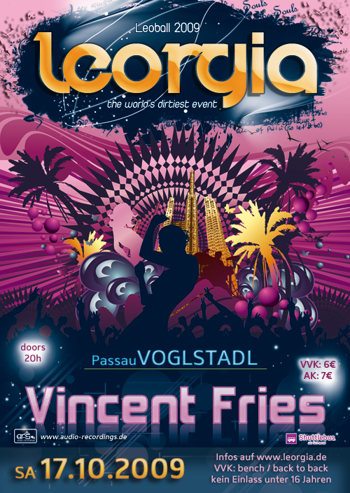 Leorgia LEORGIA Leorgia the world's dirtiest event Leoball 2oo9 am 17.Oktober 2009 im Voglstadl in Passau (Ries) mit VINCENT FRIES Einer der besten DJ's weltweit wird den Voglstadl rocken. Party bis in die frühen Morgenstunden ist garantiert. Erlebe mit uns eine unvergessliche Nacht... HAPPY HOUR von 22.30h - 23.30h Cocktails der exklusiven Art Freigetränke für 10 Mädels in den kürzesten Miniröcken und vieles mehr... Infos auf www.leorgia.de Shuttlebusverkehr zwischen Schanzl und Voglstadl im 30-Minutentakt von 20Uhr an bis zum Schluss Einlass ab 16 Jahren / Einlassrecht vorbehalten Vorverkaufsstellen: bench (Stadtgalerie) und Back To Back (FuZo) VVK: 6€ AK: 7€ |