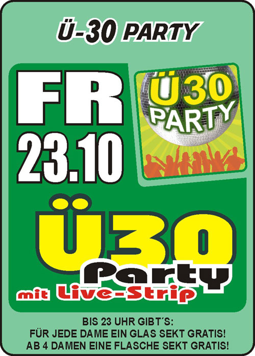 | Am 23. Oktober 2009 im Bienenkorb Straubing Ü-30 Party mit LIVE-Strip Bis 23 Uhr gibts: Für jede Dame ein Glas Sekt gratis! Ab 4 Damen eine Flasche Sekt gratis! |