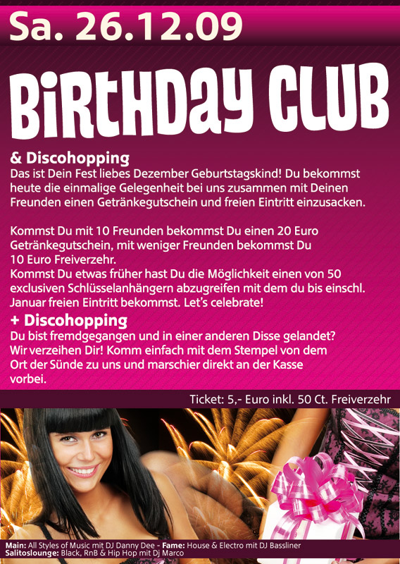 | Am 26. Dezember 2009 im Bali Eggenfelden Hip Hip Hooray, it´s Birthdayclub today Happy Birthday und Glückwunsch an alle Dezember Geburtstagskinder. Ihr bekommt von uns heute mit 10 Freunden freien Eintritt und einen 20,- € Getränkegutschein. Kommst Du mit weniger Freunden, bekommst Du einen 10,- € Getränkegutschein. Let´s celebrate! Discohopping: Du bist Fremdgegangen und in einer anderen Disse gelandet? Wir verzeihen Dir! Komm einfach mit dem Stempel von dem Ort der Sünde zu uns und marschier direkt an der Kasse vorbei. Die ersten 50 Geburtstagskinder bekommen einen exklusiven Bali-Vip-Schlüsselanhänger mit dem Du bis einschließlich Januar freien Eintritt hast. |