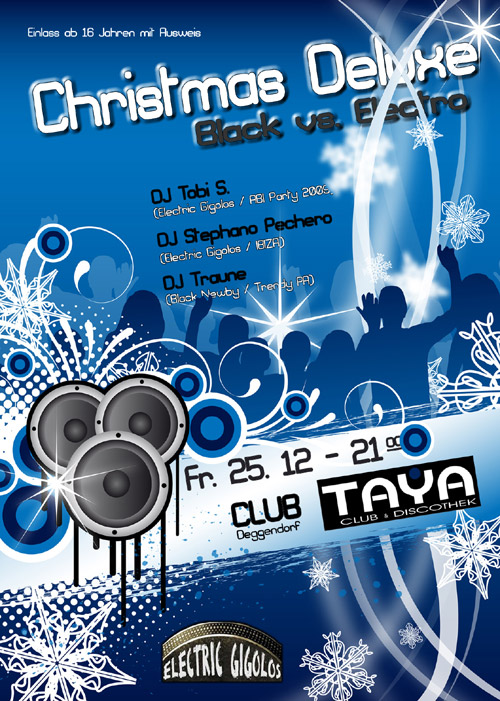 ...und weitergehts... Kaum ist Heiligabend vorbei gehts scharf in Richtung "2010". Wir feiern mit euch am 1. WEIHNACHTSFEIERTAG ein weiteres Highlight im Deggendorfer Nachtleben. Get the Party started ..... Die After Christmas Party mit Black vs. Electro. Los gehts am 25.12.2009 ab 21 Uhr im TAYA in DEGGENDORF! Einlass ab 16 Jahren mit gültigen Ausweis (bis 24 Uhr) CHRISTMAS DELUXE Die After Christmas Party LineUp: DJ TRAUNE (trendy danceclub // black newby) TOBI S. (electric gigolos // abiparty 2009) STEPHANO PECHERO (ibiza // e-city passau) Jetzt in den Meetpoint eintragen und 2 von 8 Freikarten gewinnen! Gewinner sind: jack_danielzzz Mike*** MaRiA_! larissa** |