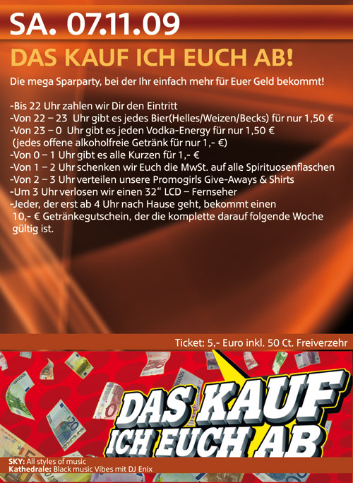 | DAS KAUF ICH EUCH AB! Die mega Sparparty, bei der Ihr einfach mehr für Euer Geld bekommt! SPECIALS: - Bis 22 Uhr zahlen wir den Eintritt - Von 22 - 23 Uhr gibt es jedes Bier für nur 1,50€ - Von 23 - 0 Uhr gibt es jeden Vodka-Energy für nur 1,50€ (jedes offene alkoholfreie Getränk für nur 1€) - Von 0 - 1 Uhr gibt es alle Kurzen für 1€ - Von 1 - 2 Uhr schenken wir euch die MwSt. auf alle Spirtituosenflaschen - Von 2 - 3 Uhr verteilen unsere Promogirls Give-Aways & Shirts - ... |