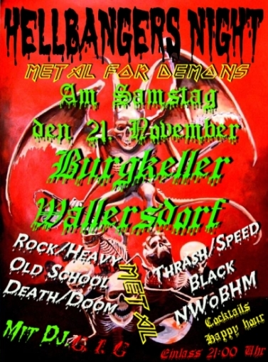 | 21. November 2009 Burgkeller Wallerdorf Hellbangers Night @ Burgkeller Metal al for Demons... - Rock/Heavy - Old School - Death/Doom - Thrash/Speed - Black - NWoBHM Für mega Stimmung sorgt DJ G.I.G Specials: Cocktails - Happy hour |