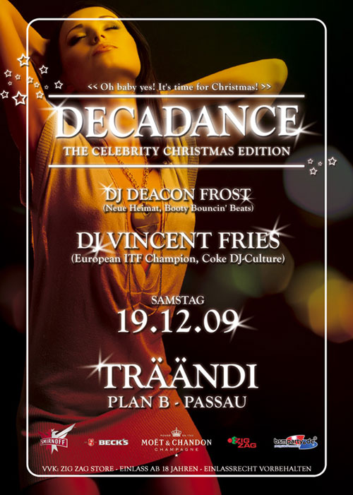 << Oh baby yes! It's time for Christmas! >> ---------------------------------------------------------------------------------------------------------------------- ^ ^ D E C A D A N C E ^ ^ The Celebrity X-Mas Edition ---------------------------------------------------------------------------------------------------------------------- Damit die Räumlichkeiten in der Dr. Hans-Kapfinger-Straße (planb, Träändi) vor ihrer endgültigen Schließung noch einmal so richtig durchgeblasen werden, wird DIE ultimative Party in Passau aus ihrem Winterschlaf erweckt, die DECADANCE is back! ... gnadenlos und besser denn je! Am 19.12. ab 22 Uhr werden keine geringeren als Coke DJ-Culture Award Winner + DJ Europameister & VizeWeltmeister „Vincent Fries“ sowie „Deacon Frost“ Spiegeleier auf Stimmung braten und mit ihren nach vorne treibenden Booty Bouncin' Beats den letzten trockene Hemd vollends durchnässen! Doch damit nicht genug! Eine Musikrichtung allein - das reicht UNS NICHT! Im Red Room prasselt es daher Electro satt! Mit seinem progressiven und gnadenlosen Electro-Style ist „Matthew“ der unumstrittene God-Father der Passauer-Electro-Szene! Um dies zu beweisen, dreht er am 19.12. den Autopiloten auf MEGA-Off, die Anlage auf ULTRA-Überschall und mit der tobenden Masse VOLL-durch! Freut euch auf Abwechslung satt, alle Hände in der Luft und „all the single ladies“ … oh yeah! MAIN FLOOR (Booty Bouncin' Beats) --------------------------------------------------------------------- Vincent Fries (European ITF Champion, Der Pate) Deacon Frost (Neue Heimat, Decadance) RED ROOM (House // Electro) --------------------------------------------------------------------- Matthew (Electronic House Project) Philippe van Leyden (Liquid Resident) ---------------------------------------------------------------------------------------------------------------------- Gewinnspiel Gewonnen haben: --------------------------------------------------------------------- mygirl17 Mone***** Kleine*91 schnapes ---------------------------------------------------------------------------------------------------------------------- 2 - 1 BOOM! Der Finale-Party-Countdown! --------------------------------------------------------------------- 2 19.12. // DECADANCE - The Celebrity X-Mas Edition 1 25.12. // Roots Rockers - Coming Home For Christmas BOOM! 31.12. // BOOM - Silvester wird geknallt! ---------------------------------------------------------------------------------------------------------------------- >> In den Meetpoint eintragen! << |