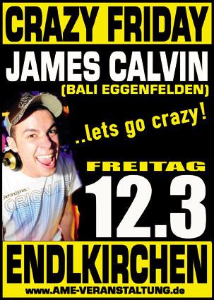 DJ JAMES CALVIN @ Disco Endlkirchen AME Veranstaltungen präsentiert am Freitag, 12. März 2010 die CRAZY FRIDAY Partynight mit dem absolut irren DJ JAMES CALVIN (Donnerstag Bali Eggenfelden) in der Disco ENDLKIRCHEN (bei Erlbach). Infos zum Event gibt es unter www.ame-veranstaltung.de |