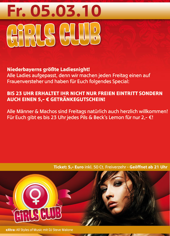 | Girls Club @ eXtra Niederbayerns größte Ladiesnight! Alle Ladies aufgepasst, denn wir machen jeden Freitag einen auf Frauenversteher und haben für Euch folgendes Special: BIS 23 UHR ERHALTET IHR NICHT NUR FREIEN EINTRITT SONDERN AUCH EINEN 5,- € GETRÄNKEGUTSCHEIN! Alle Männer & Machos sind freitags natürlich auch herzlich willkommen, für Euch gibt es bis 23 Uhr jedes Pils & Beck’s Lemon für nur 2,- €! eXtra – all styles of music mit DJ Steve Malone |