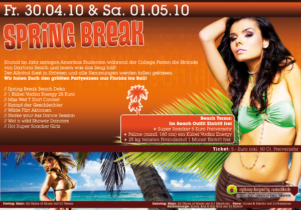 | Spring Break (Part 1) Einmal im Jahr zerlegen Amerikas Studenten während der College-Ferien die Strände von Daytona Beach und feiern was das Zeug hält! Der Alkohol fliest in Stömen und alle Hemmungen werden fallen gelassen. Wir holen Euch den größten Partyexzess aus Florida ins Bali! - Spring Break Beach Deko - 1 Kübel Vodka Energy 25,- € - Miss Wet-T-Shirt-Contest - Kampf der Geschlechter - Wilde Flirt Aktionen - Shake Your Ass Dance Session - Wet n wild Shower Dancers - Hot Super Soacker Girls Beach Terms: Im Beach-Outfit Eintritt frei! + Super Soacker 5,- € Freiverzehr + Palme (mind. 160cm) ein Kübel Vodka Energy + 25kg feinsten Strandsand 1 Monat Eintritt frei |