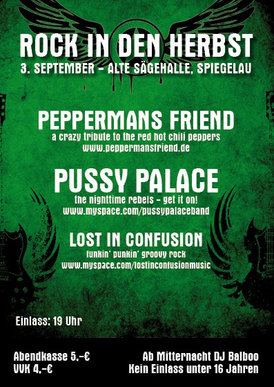 | 3. September 2009 Alte Sägehalle Spiegelau Die vierte Auflage der "Rock in den Herbst Veranstaltung" findet heuer wieder statt. Die Band´s stehen schon fest: - Peppermans Friend - Pussy Palace - Lost in Confusion - Ab Mitternacht: Party mit DJ Balboo - Für Essen und Trinken ist gesorgt - Für die Nachtschwärmer gibt es eine 12m lange Bar Jugendschutz: Grundsätzlich gilt auf dem gesamten Festivalgelände das Jugendschutzgesetz! Als Veranstalter werden wir diese Vorgaben beachten! Das bedeutet u.a.: Kein Ausschank von Spirituosen an Minderjährige! Jugendliche unter 16 erhalten zum Festivalgelände keinen Zutritt! Daher dürfen sich Jugendliche zwischen 16 und 18 nur bis 24.oo Uhr ohne Erziehungsberechtigte auf dem Festivalgelände aufhalten. Danach müssen sie leider das Gelände verlassen! Die Ausweise der Unter-18-Jährigen werden während des Besuchs einbehalten! Ausnahme: In Begleitung euerer Eltern dürft Ihr so lange bleiben, wie diese dabei sind, also auch nach 24.00 Uhr! Ausweise der Eltern werden solange einbehalten. Kartenvorverkauf: Tankstelle Hilpert Spiegelau |