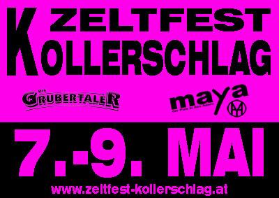 | Endlich ist es wieder soweit: ZELTFEST KOLLERSCHLAG, 7-9. MAI 2010 Freitag: Die Grubertaler, DJ Sterzgams, Weißbierzelt, Weinbar, Pilsbar Samstag: MAYA, DJ Sterzgams, Weißbierzelt, Weinbar, Pilsbar Sonntag: Frühschoppen mit "3-fach stark", große Tombola ZELTFEST KOLLERSCHLAG, 7-9. MAI 2010 |