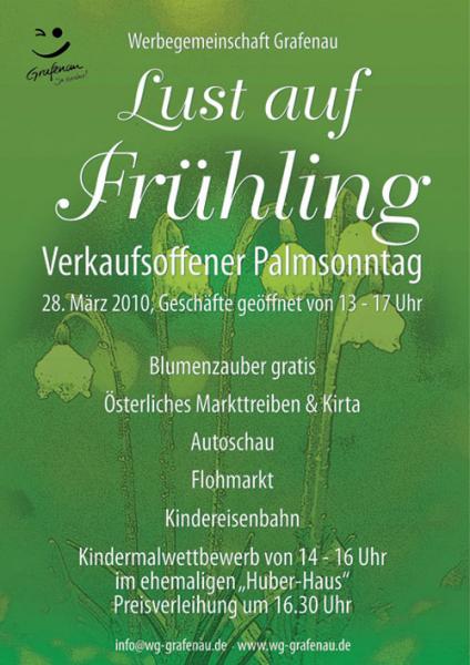 | LUST AUF FRÜHLING Verkaufsoffener Palmsonntag in Grafenau am 28.03.2010 Geschäfte geöffnet von 13 - 17 Uhr SPECIALS: - Blumenzauber - Österliches Markttreiben & Kirta - Autoschau - Flohmarkt - Kindereisenbahn Kindermalwettbewerb von 14 - 16 Uhr im ehemaligen "Huber-Haus" Preisverleihung um 16.30 Uhr Zum verkaufsoffenen Palmsonntag sind die Geschäfte von 13 bis17 Uhr geöffnet. Der Gartenbauverein Grafenau schmückt den Osterbrunnen schon vorher. An diesem Tag gibt es wieder für unsere Kunden Frühlings-Blumen wie Primel, Vergißmeinnicht, Bellis, Stiefmütterchen, Hornveilchen gratis. Die Wirte werden, vorausgesetzt das Wetter spielt mit, ihre Terrassen öffnen. Der Kirta und das österliche Markttreiben sowie der Flohmarkt in der Hauptstraße beginnt bereits ab 7 Uhr morgens. Autohändler stellen ihre neuesten Modelle vor. Auch das Autohaus Hable sowie Auto Röhr haben an diesem Tag geöffnet. Ein Blumenostermarkt vor Modehaus Blach mit Blumen Liebl lädt ein. Die Kindereisenbahn kreist wieder um den Säumerbrunnen, Gratis- Fahrgutscheine sind in den Geschäften der Werbegemeinschaft erhältlich. Osterhasen verteilen bunte Eier und österliche Süssigkeiten. Somit wird an diesem Tag von Sport Fuchs bis Optik Höfling die Stadt wieder zur autofreien Fußgängerzone. |