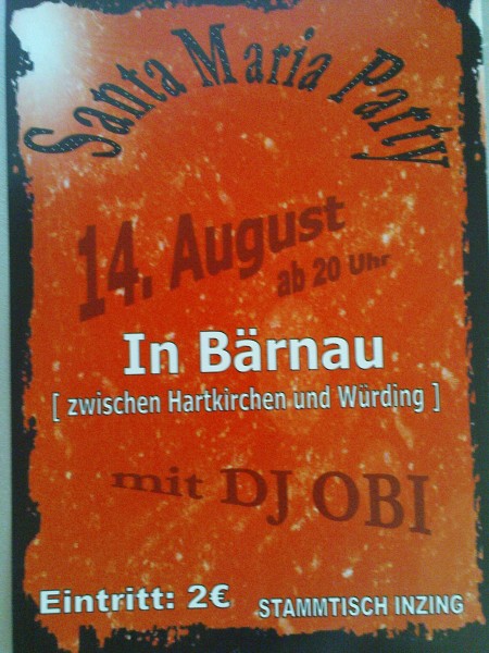 | Santa Maria Party 2010 Wie jedes Jahr einen Tag vor dem Feiertag findet wieder unsere Santa Maria Party in der Maschinenhalle in Bärnau ( zwischen Hartkirchen und Würding )statt. - Wie jedes Jahr mit DJ OBI! - Günstige Getränkepreise und jede Menge Spaß sind garantiert. Mit 8m langer Bar, extra Massenbar ( Schneemaß, Goaßmaß ), Pilsinsel im Freien und Sitzgelegenheit in der Halle und im Außenbereich |