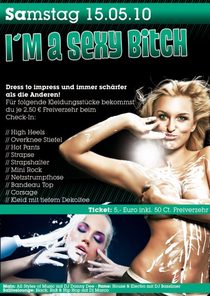 | I'm a sexy Bitch Dress to impress und immer schärfer als die Anderen! Für folgende Kleidungsstücke bekommst du je 2,50 € Freiverzehr beim Check-In: - High Heels - Overknee Stiefel - Hot Pants - Strapse - Strapshalter - Mini Rock - Netzstrumpfhose - Bandeau Top - Corsage - Kleid mit tiefem Dekoltee |