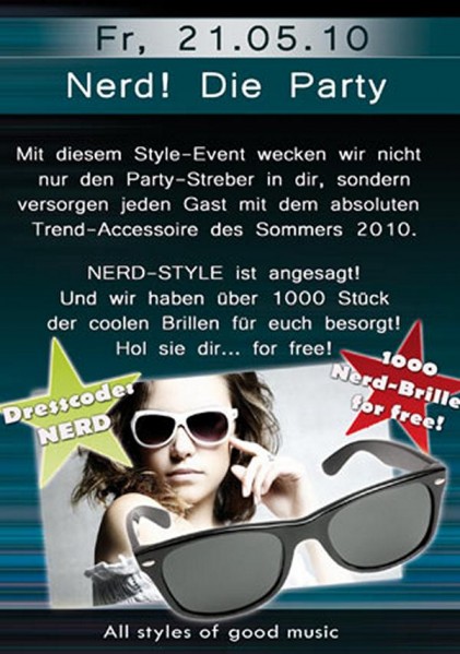| Mit diesem Style-Event wecken wir nicht nur den Party-Streber in dir, sonder versorgen jeden Gast mit dem absoluten Trend-Accessoire des Sommers 2010! Nerd-Style ist angesagt! Und wir haben über 1000 Stück der coolen Brillen für euch besorgt! Hol sie dir! for free! ------------------------------------------------------------------------------------------------------------ Mainarea: House,Black,Mashups,Rock, Oldies, Party mixed by Resident DJ RobRockz a.k.a T-Killa Keller Music Club: All styles of Dancemusic and Black music by Resident DJ John Taylor a.k.a Gorgeous X ----------------------------------------------------------------------------------------------------------- Unsere 3 abgetrennten Areas mit 5 Lounges und 2 Freiluftbereichen bieten dir jede Menge Abwechslung: Unter 18 Formular ist jetzt möglich!! more Infos : www.disco-penker.de |