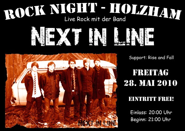 | Rock Night @ Holzham Am 28. Mai wird Next in Line im Rahmen des legendären Holzhamer Dorffestes der Schützengesellschaft auf der Bühne stehen, um die tobende Menge mit erstklassiger Rockmusik zu beschallen. Sie wird dabei von der Band "Rise and Fall" unterstützt, die als Vorband die Plätze on Stage aufwärmen. Ab 20 Uhr ist Einlass und ab 21 Uhr werden die Bands die Biertische zum Wackeln bringen. Wir freuen uns schon auf zahlreiche Headbanger. |