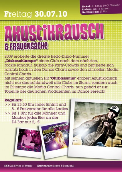 | Freitag 30.07.10. Akustikrausch & Frauensache 2009 eroberte die dreiste Hedo-Disko-Nummer „Diskoschlampe“ einen Club nach dem nächsten, rockte landauf, flussab die Party-Crowds und platzierte sich ratzfatz hoch in den Dance Charts sowie den offiziellen Media Control Charts. Mit seinem aktuellen Hit "Ohrbassmus" erobert Akustikrausch nicht nur deutschlandweit alle Clubs im Sturm, sondern auch im Eiltempo die Media Control Charts, nun gehört er zur Topelite der deutschen Produzenten im Dance Bereich! Regulars: >> Bis 23.30 Uhr freier Eintritt und 5,- € Freiverzehr für alle Ladies >> Bis 1 Uhr für alle Männer und Machos jedes Bier an der DJ-Bar nur 2,- € Ticket: 5,- Euro inkl. 50 Ct. Freiverzehr – Geöffnet ab: 21 Uhr SKY: All Styles of Music – Kathedrale: Black & Beautiful |