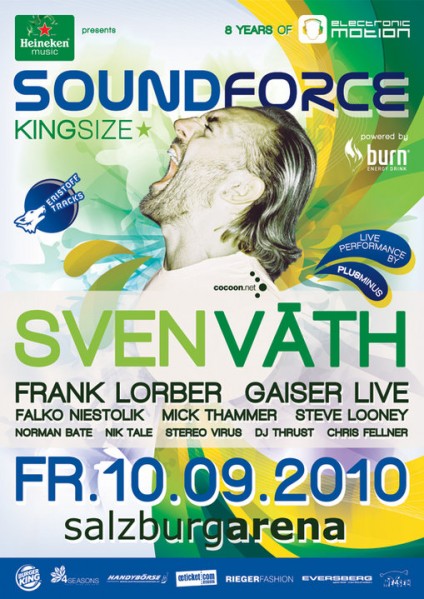 | FREITAG 10.09.2010 Einlass: 20:30 Uhr Start: 21:00 Uhr > EINTRITT AB 18 JAHREN!!! Heineken Music presents: 8 JAHRE ELECTRONIC MOTION feat. SOUNDFORCE K.I.N.G.S.I.Z.E. powered by BURN energy. @ SALZBURGARENA / Am Messegelände http://www.salzburgarena.at/ HALL OF FAME: > SVEN VÄTH (4h set!!!) || http://www.cocoon.net/ > GAISER live! || http://www.m-nus.com/ > FRANK LORBER || http://www.franklorber.de/ warm up by: > STEVE LOONEY > LIVE PERFORMANCE by: PLUS MINUS > LIVE VISUALS - PYRO SHOW and more! TECH-HOUSE & ELECTRO LOUNGE: hosted by: eristoff tracks > FALKO NIESTOLIK || http://www.falkoniestolik.de/ > MICK THAMMER || http://www.mickthammer.com/ ➢ support: NIK TALE - NORMAN BATE - STEREO VIRUS - DJ THRUST - CHRIS FELLNER VVK: 25€ zzgl. Gebühren, AK: 30€ > TICKET CORNER: - ONLINE TICKET Shop: http://www.electronic-motion.com/ - Ö-Ticket || http://www.oeticket.com/ - In allen Raika Filialen OÖ & Salzburg - 4Seasons Boardshop (Keine VVK Gebühren!) - Handybörse | SCA + Kiesel (Keine VVK Gebühren!) - Rieger Fashion @ Europark (Keine VVK Gebühren!) - A1 Business Partner Eversberg Salzburg (Keine VVK Gebühren!) > NUTZE FÜR DIESEN EVENT DAS ÖBB EVENT TICKET!!! > BIS ZU 60% ERMÄßIGUNG AUF JEDE BAHNFAHRT ÖSTERREICHWEIT!!! Infos: http://www.event.oebb.at/ oder http://www.oebb.at/pv > Press/Guestlist/VIP: bianca@electronic-motion.com > MAIN INFOS: http://www.electronic-motion.com/ http://www.salzburgarena.at/ |
