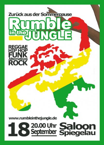 | RUMBLE IN THE JUNGLE "zurück aus der Sommerpause" SA. 18.09. ab 20.00 Uhr im Saloon Spiegelau/Palmberg REGGAE - HIP HOP - FUNK - ALTERNATIVES - ROCK WHISKEY - COCKTAILS - BEER - ....................... Eintritt Euro 1,-- www.rumbleinthejungle.de |