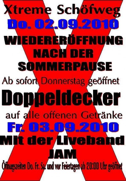 | 02. September 2010 X-treme in Schöfweg Xtreme Schöfweg - Jeden Donnerstag Doppeldecker auf alle offenen Getränke |