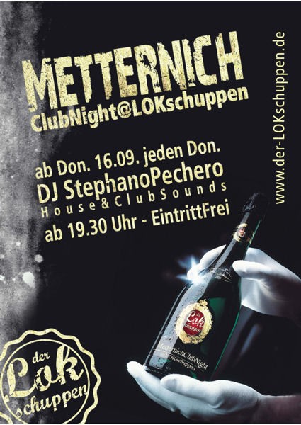 | Metternich Club Night @ LOKschuppen im Lokschuppen Simbach am Inn jeden Donnerstag im LOKschuppen ab 19.30 Uhr Ob „AfterWorkParty“, vorzeitiger Wochenendstart oder einfach nur Freunde treffen und leckere Sekt-Specials trinken. In der LOKlounge ist dies alles möglich. Entspannte Clubsounds werden die Wohl-Fühl-Atmosphäre noch unterstreichen. Für den besten Sound sorgt für Euch "DJ STEPHANO PECHERO" der die neuesten Tunes von der Sonneninsel Ibiza mit im Gepäck hat. |