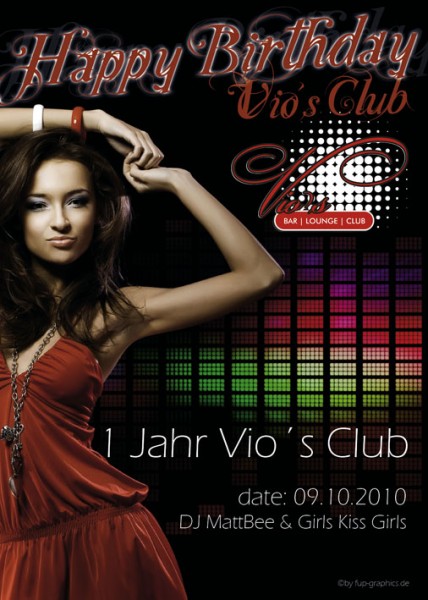 | ********************************************************************* Happy Birthday Vio*s Club ********************************************************************* 1 Jahr Vio*s Club Im Oktober 2009 war es soweit, der Vio*s Club hatte sein grosses Opening. Aus diesem Anlass feiern wir mit Euch am 09.10.2010 die grosse Geburtstagsfeier unseres Clubs. 1 Jahr Vio*s Club mit grossen und teilweise sehr verrückten Partys ist vorüber. Das Vio*s Club Allstarteam moechte sich hiermit bei allen Gästen und Freunden für das tolle erste Jahr bedanken. Wir beginnen unsere Geburtstagsfeier bereits um 18 Uhr mit einer Openair-Bar auf der Terrasse mit Getränkespecials für alle Gäste. Ab 21 Uhr startet die Party für Euch im Vio*s Club mit den Dj*s MattBee und Girls Kiss Girls. ___________________________________________________________________ ab 18.00 Uhr: Openair-Bar auf der Terrasse (Cafe Fiona,Vio*sClub) ab 21.00 Uhr: Partystart im Vio*s Club Musik: DJ MattBee (LoveSensation) Girls Kiss Girls (Abschlussbilanz) Free Welcomedrinks for Boys & Girls DANKE AN ALLE TREUEN GÄSTE FÜR DAS TOLLE ERSTE JAHR! |