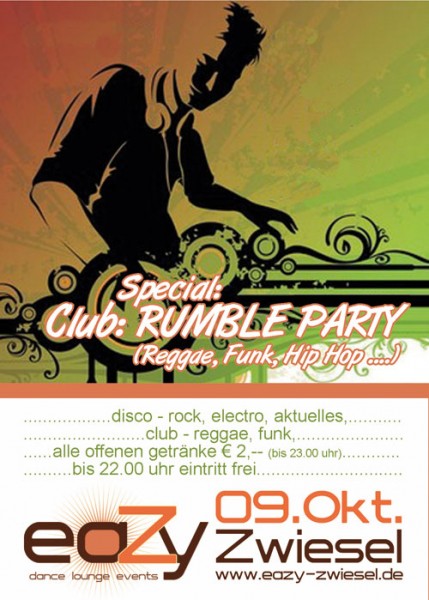 | 09.10.2010 - Disko: Rock, Electro, Aktuelles, .... Club: RUMBLE PARTY - Reggae, Hip Hop, Funk, .... Specials: bis 22.00 Uhr Eintritt frei bis 23.00 Uhr alle offenen Getränke Euro 2,-- FREITAGs Disco: Night Fever - Das beste aus 40 Jahren Musikgeschichte Club: Alternatives Samstag (geöffnet von 21.00 Uhr – 05.00 Uhr) Unsere kommenden Events an den Samstagen und vor Feiertagen 16.10.2010 - 90er Party - von peinlich bis geil alles dabei Special:Doppeldeckerparty bis 23.00 Uhr 2 Getränke zum Preis von einem 23.10.2010 - Konzert: The JANCEE PORNIC CASINO Der amerikanische Gitarrist und Sänger Jancee Warnick trifft im Kölner Exil auf zwei verrückte Russen und gründet mit ihnen eine der skurrilsten und explosivsten Rock'n Rollbands unserer Zeit. Seit 1999 lebt das Trio im Tourbus und pflügt eine Schneise des Erfolgs durch Europa. Unzählige Konzerte in kleinen Spelunken und großen Hallen lassen ihre Fangemeinde stetig wachsen und festigen ihren Status als Kultband. Das PORNICK CASINO mixt einen unwiderstehlichen (Molotow-) Cocktail aus Surfmusik, Rockabilly und 60's Garage Punk, der stets mit einer guten Portion wodkagetränkter russischer Seele sowie Adrenalin und Selbstironie angereichert wird. Jancee's springteufelartige Bühnenpräsenz versucht dabei, die Virtuosität eines BRIAN SETZER mit der Energie eines ANGUS YOUNG zu kreuzen und wird dabei angetrieben von Vladimirs Bassbalalaika und Stanislavs Drumfeuerwerk mit der Stärke eines sibirischen Orkans. www.janceewarnick.com Eintritt Euro 5,-- 30.10.2010 - Halloween Party - Freier Eintritt für alle im Halloween-Qutfit - Gratis Halloween Begrüßungsdrink - Euro 50,-- Getränkegutschein fürs beste Qutfit - Best eaZy Sound by DJ ALEX 06.11.2010 - LIVE REGGAE mit FITTA WARRI from Kingston Jamaica On Stage: FITTA WARRI - Live Reggae & Dancehall from Kingston Jamaica backed by Rumble Sound Posse Fitta im Web: www.myspace.com/vangardleada Nach der Show: REGGAE, FUNK, HIP HOP, Alternatives, .............. Eintritt Euro 5,-- , Einlass 21.00 Uhr Voranzeige: 2nd eaZy BAND CONTEST - 1. Platz EURO 1.000,-- Teilnahme: Bands aus dem Bayerischen Wald, egal ob Rock, Punk, Reggae, Party, Hip Hop ...... (Alle Bandmitglieder müssen mind. 16 Jahre alt sein.) Modus: 6 Bands treten an 2 Vorentscheidungsabenden gegeneinander an. Aus diesen 2 Vorentscheidungen ergibt sich die Finalrunde aus den beiden Siegern. Ein Moderator führt durch die Shows der einzelnen Bands ehe dann das Publikum über den Sieger abstimmt. Jede Band hat 20 Minuten Programm um das Publikum zu überzeugen. Termine: Vorausscheidungsrunden 20. November 2010 04. Dezember 2010 Finale 18. Dezember 2010 Sieger: Die Siegerband erhält Euro 1.000,-- in bar Jede teilnehmende Band erhält einen Einkaufsgutschein im Wert von Euro 100,-- im Musikfachgeschäft Musikdiscount24 in Viechtach. Anmeldung unter: www.eazy-zwiesel.de oder Tel. 0178/9753055 Anmelden bis spätestens 23.10. |