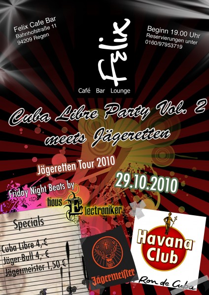 | Cuba Libre Party Vol. 2 meets Jägeretten Jägeretten Tour 2010 Nach dem grossen Erfolg der 1. Cuba Libre Party im Juli 2010 folgt hier die nächste Party.. Als besonderes Highlight kommen die Jägeretten und heizen euch so richtig ein. Getränkespecials: - Cuba Libre 4€ - Jäger-Bull 4€ - Jägermeister 1,50€ Music made bye HousElectroniker! (Relax-Bar,Club Cuba, Palais München) Reservierungen unter 0160/97953719 |