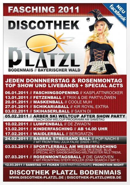 Heute in der Discothek PLATZL Bodenmais _____________________________________________________________ Faschingsopening 2011 Jeden Donnerstag + Rosenmontag Top Show und Livebands zu unseren Faschingsbällen 2011 ... _____________________________________________________________ - Normaler Discotheken Betrieb - - Play Time in unserer Spielhalle - - Cocktailbar by. Sven Geöffnet ab 22.00Uhr - ALLE INFOS UNTER: www.discothek-platzl.de |