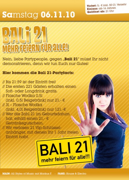 | Bali 21 Nein, liebe Partypeople, gegen „Bali 21“ müsst Ihr nicht demonstrieren, denn wir tuen Euch nur Gutes! Hier kommen die Bali 21-Partyfacts: - Bis 21:59 ist der Eintritt frei! - Die ersten 221 Gästen erhalten einen Soft- oder Longdrink gratis. - Flasche Wodka 0,5l (inkl. 0,5l Beigetränk) nur 21,- € - 3l – Flasche Wodka (inkl. 4,0l Beigetränk) nur 121,-€ - Wer die Zahl 21 im Geburtsdatum hat, erhält einen 21,- € Getränkegutschein. - Wir verlosen 21 Vip-Schlüsselanhänger, mit denen Ihr 1 Jahr freien Eintritt habt. Ticket: 5,- Euro inkl. 50 Ct. Freiverzehr – Geöffnet ab: 21 Uhr Main: All Styles of Music mit Markus F. Fame: House & Electro |
