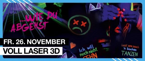 | Voll Laser 3D Voll Laser wie du abgehst Nein Mann, (alle Ladies erhalten bis 22.00 Uhr einen 5 €uro Getränkegutschein) ich will noch nicht geh‘n (die letzten 30 Gäste erhalten 1 empire Neon T-Shirt) lass uns noch n´ bißchen tanzen Das Schwarzlicht wird in dieser Nacht die Farben zum Leben erwecken! Komm im Neon Outfit und und du erhältst bis 22.30 Uhr freien Eintritt! • Laser Show • Neon Dancers • Lightsticks • Neon Deko • Neon Bodypainting |