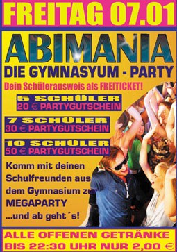 | 07. Januar 2011 Disco Endlkirchen Abimania @ Endlkirchen ...Die Gymnasium-Party Specials: - Dein Schülerausweis als FREITICKET - Alle offenen Getränke bis 22.30 Uhr nur 1,50 € - 5 Schüler = 20 € Partygutschein - 7 Schüler = 30 € Partygutschein - 10 Schüler = 50 € Partygutschein Komm mit deinen Schulfreunden aus dem Gymnasium zur MEGAPARTY und ab gehts! |