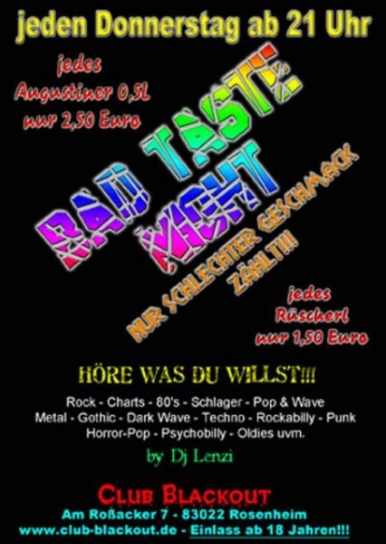 | 23. Dezember 2010 Club Blackout in Rosenheim Bad Taste Night @ Blackout Musik: Rock, 80's, Schlager, Pop & Wave, Metal, Gothik, Punk uvm. ! by DJ Lenzi Special: - Jedes Rüscherl nur 1,50 € - Jedes Augustiner 0,5 L nur 2,50 € |