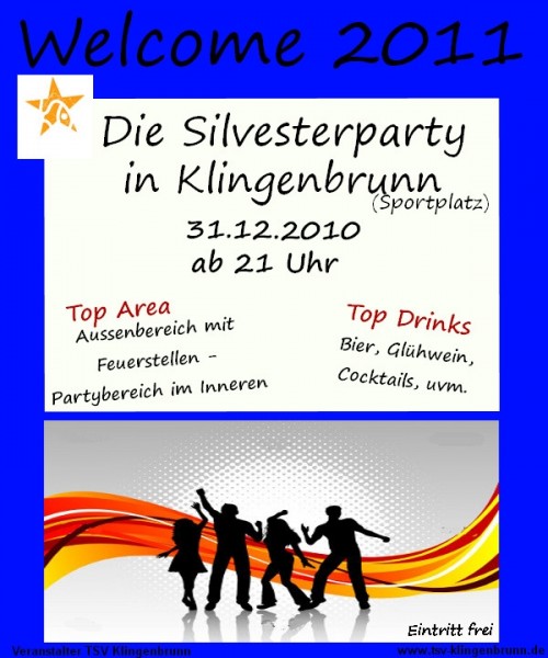 | Welcome 2011 - Silvesterparty Wie bereits im letzten Jahr steigt am Klingenbrunner Sportplatz wieder eine große Silvesterparty. Eine beheizte "Party-Area" im Inneren, sowie Feuerstellen im Aussenbereich sorgen für das nötige Ambiente. Euch erwartet zudem die beste Musik aus den letzten 2010 Jahren. Abwechselnd wird hier die Richtung gewechselt, damit jeder auf seinen Geschmack kommt. Um das Jahr nicht trocken ausklingen zu lassen gibt es natürlich wieder eine Bar, welche euch das beste Angobt aus Schnäpsen und Cocktails zur Verfügung stellt. Für die traditionelleren Trinker unter euch ist natürlich die Brauerei Stangl mit seinem süffigen Bier vertreten. Für feste Nahrung ist ebenfalls gesorgt. LASST UNS GEMEINSAM INS NEUE JAHR FEIERN!!! |