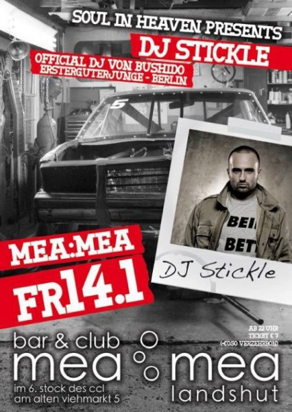 | 14. Januar 2011 MeaMea in Landshut Soul in Heaven presents: DJ Stickle DJ Stickle - Official DJ von Bushido (Ersterguterjunge - Berlin) |