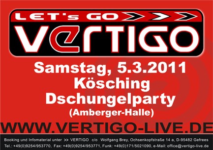 | Dschungelparty mit VERTIGO HEAR WE ARE! Die Partyband VERTIGO kommt erstmals nach Kösching zur traditionellen Dschungelparty am Faschings-Samstag.Mit Dabei die Faschingsgesellschaft Kösching mit ihrem umwerfenden Programm 2011. Also auf ins fränkische "Dschungelcamp" nach Kösching/Amberger-Halle. Wir feiern eine "Party bis Euch schwindlig wird". |