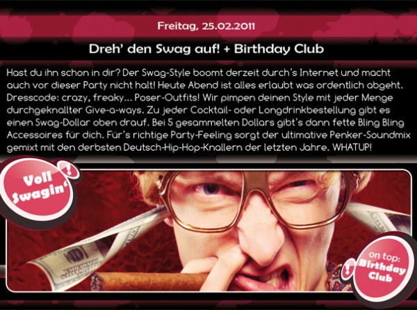 | Dreh´ den Swag auf!+Birthday Club@Penker Hast du ihn schon in dir?Der Swag-Style boomt derzeit durchs Internet und macht auch vor dieser Party nicht halt! Heute Abend ist alles erlaubt was ordentlich abgeht. Dresscode: freaky,crazy....Poser Outfits! Wir pimpen deinen Style mit jeder Mege durchgeknallter Give-a-ways! Zu jeder Longdrink oder Cocktailbestellung gibt es einen Swag-Dollar oben drauf! Bei 5 gesammelten Swag-Dollern gibt es dann fette Bling Bling Accessoires für dich! Für´s richtige Partyfeeling sorgt der ltimative Penker-Soundmix gemixt mit den derbsten Deutsch-Hip-Hop-Knallern der letzten Jahre! WHAT UP! --------------------------------------------------------------- in der Mainarea: House, Black ,Rock ,Charts, MashUps, Party & Classics mixed by Resident DJ RobRockz a.k.a T-Killa im Keller Music Club: Electro, Hardstyle, HandsUp, Black music by Resident DJ John Taylor a.k.a Gorgeous X --------------------------------------------------------------- 3 Areas, 7 Bars, 6 Lounges, 2 Freiluftbereiche Disco Penker :COME,PARTY WITH ME |
